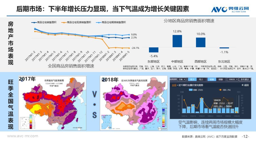 大盘市场:后地产时代来临,空调市场三四线普及需求和电商稳定增长带动带动上半年行业大盘向上。当下旺季来临,市场需求释放得关键是天气,但从7月初两周市场表现来看,后期增长压力加大。
