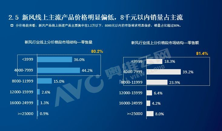 ——新风线上主流产品价格明显偏低,8千元以内销量占主流: 分价格段看,新风线上产品主要集中在12000元以内,8000元以内的产品需求偏多,达到80.2%。
