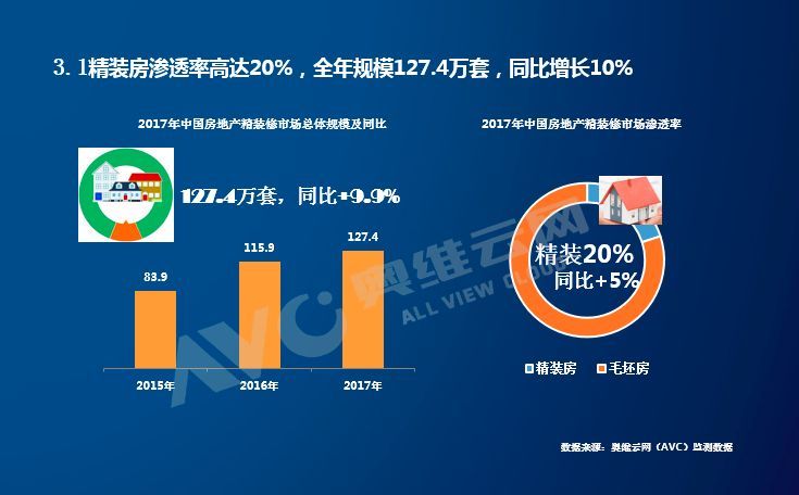 ——2017年精装房渗透率高达20%,规模达127.4万套,同比增长10%。